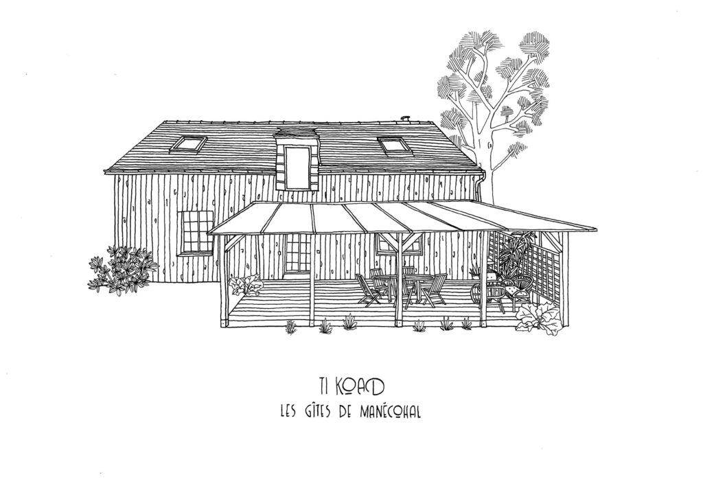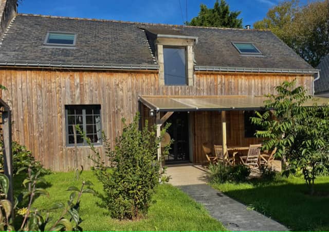 Ti koad, ( « maison en bois » en breton) fait parti d’une ancienne ferme. Rénovée en 2021, elle est parée d’un bardage bois et flanquée de deux terrasses donnant sur des jardins. La maison et les jardins sont entièrement indépendants. Elle dispose d’un parking privé pouvant accueillir deux voitures.